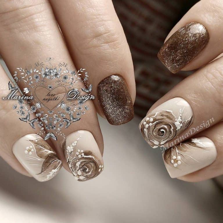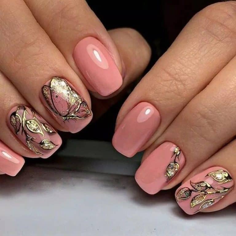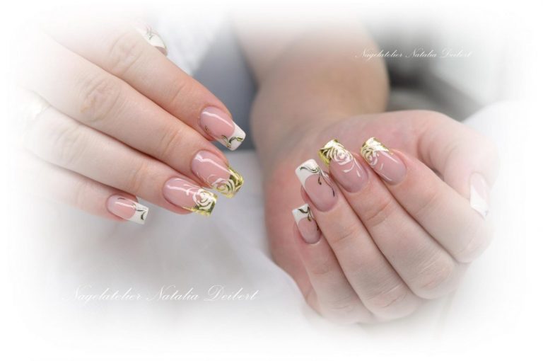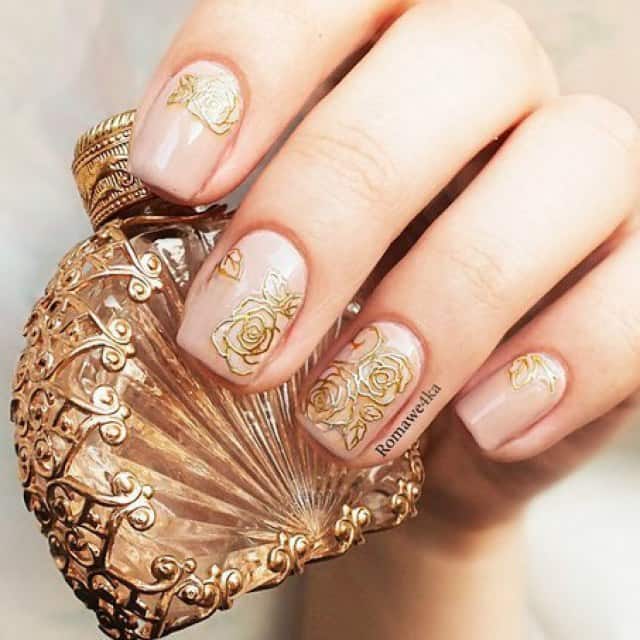Bardzo pięknie i elegancko będzie wyglądał manicure z obszernymi kwiatami o złotym kolorze wykonany techniką rzeźbienia. W przypadku krótkich paznokci lepiej jest używać małych i zwięzłych wzorów kwiatowych. Złote kwiaty na paznokciach to wzór, który trzeba stosować umiejętnie. Jeśli nigdy nie zawiodłaś się na swojej stylistce to na pewno zrobi Ci ona piękny i odpowiednio dobrany manicure ze złotymi kwiatami.