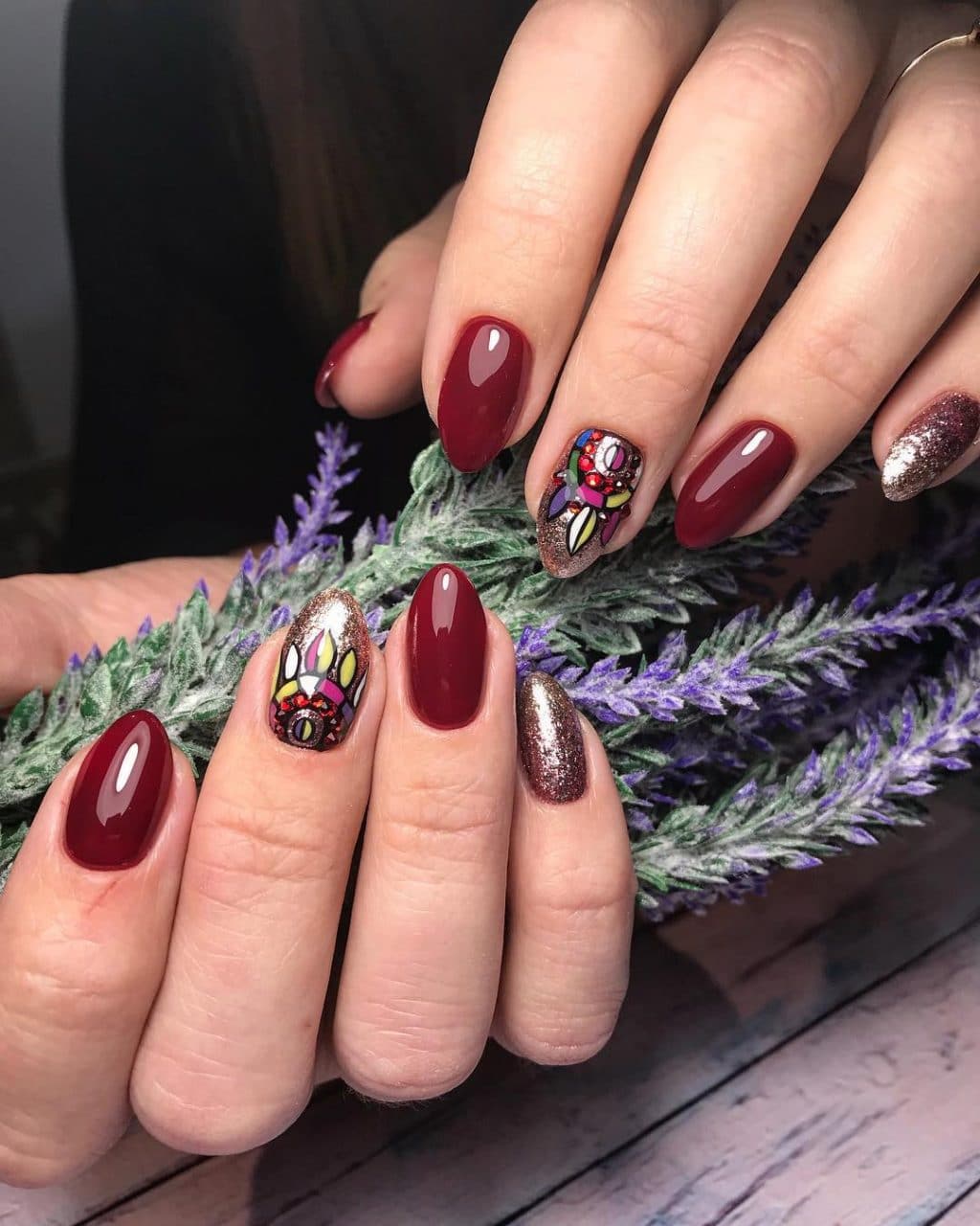 Paleta manicure wiśniowego jest bardzo zróżnicowana, od bogatej czerwieni po głęboką ciemną czerwień. Taki manicure wygląda oryginalnie szczególnie obok wzorów i rysunków w złotym lub czarnym kolorze. Ciemny matowy paznokcie wiśniowe będą świetnie wyglądały także na krótkich paznokciach. Wiśniowa stylizacja będzie wyglądać jednocześnie jasno i elegancko. A dodając odrobinę blasku w matowym stylu, staje się niemal świąteczna.